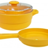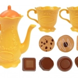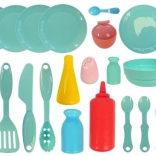 Hrniec s pokrievkou, panvička, tanieriky, šálky aj fľaštičky na dochucovadlá – všetko, čo malý kuchár potrebuje.