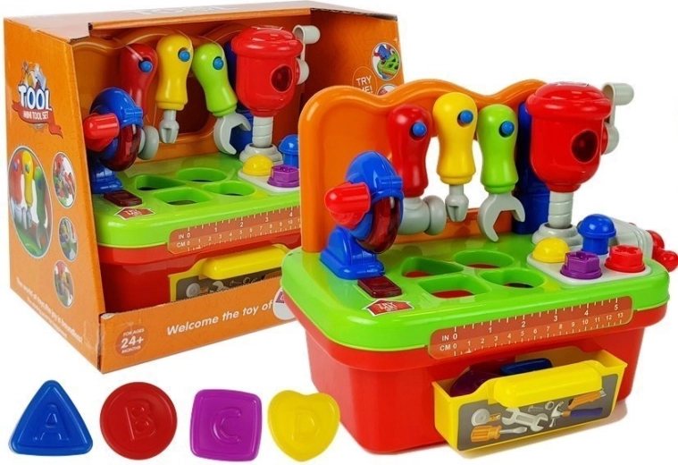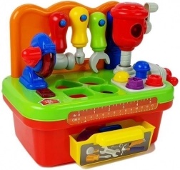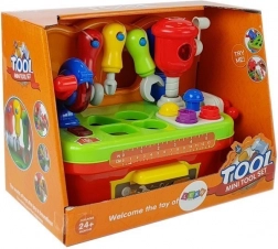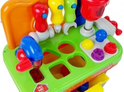 Malé nástroje, ako je píla alebo vŕtačka, vydávajú zvuky a svietia červenou diódou. Naša malá dielňa je navyše vybavená zásuvkou, do ktorej si môžete ukladať svoje poklady a náradie. Skrutky v tvare gombíkov budú rozvíjať presnosť vášho dieťaťa. Zverák možno otáčať dookola. S touto súpravou sa vaše dieťa naučí nielen tvary, štruktúru, ale aj farby. Bude sa môcť naučiť názvy nástrojov, ako fungujú, a dodatočné svetelné a zvukové efekty spríjemnia jeho hru a zabavia ho na dlhé hodiny. Stane sa z neho malý kutil.