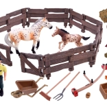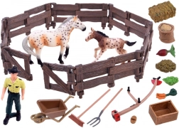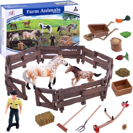 Táto bohato vybavená sada prenesie deti do sveta farmy. Nájdú v nej dve verne spracované figúrky koní (kobyla a žriebä), farmára, ohradu a množstvo doplnkov ako fúrik, vidly, hrable, koryto a krmivo. Realistické detaily, od textúry "dreva" na plote po sfarbenie koní, podnecujú fantáziu a dlhé hodiny hry.