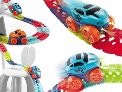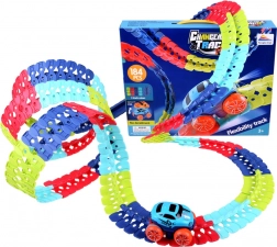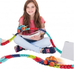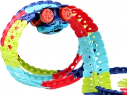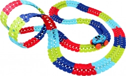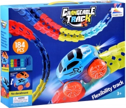 Táto farebná autodráha z odolného plastu sa skladá zo 184 prepojiteľných segmentov, ktoré možno ľubovoľne ohýbať a prestavovať. Vytvorte si dynamickú trasu plnú zákrut, smyčiek a prevýšení – vodiaca lišta uprostred dráhy pomáha udržať autíčko bezpečne na trati. Autíčko po vložení 3× AAA (nie sú súčasťou) vyrazí vpred jediným stlačením tlačidla a počas jazdy svieti červeným a zeleným svetlom.