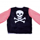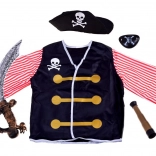 Štýlový detský pirátsky kostým na maškarný bál, karneval aj Halloween poteší každého malého dobrodruha. Súčasťou sú ikonické doplnky: pirátsky klobúk, meč, teleskopická luneta, páska na oko a blúzka s pruhovanými rukávmi. Kostým je pohodlný, ľahký a vhodný pre deti od 3 rokov.
