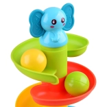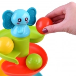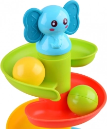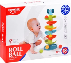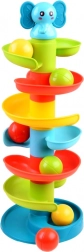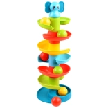 Táto farebná špirálová guľôčková dráha so sympatickým sloníkom na vrchole zaujme deti okamžite. Šesť farebných platforiem vytvára plynulú dráhu, po ktorej sa guľôčky svižne kotúľajú a pritom príjemne hrkocú. Sloník má mäkké gumové uško vhodné ako šetrné hryzátko pre prerezávajúce sa zúbky.