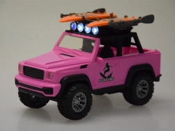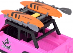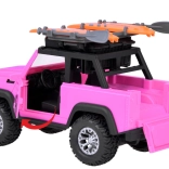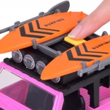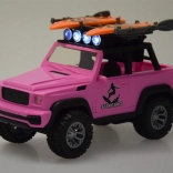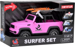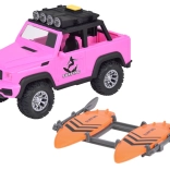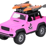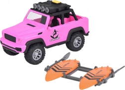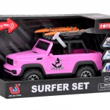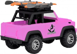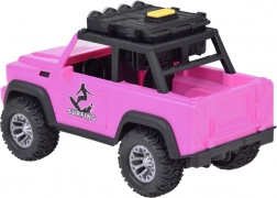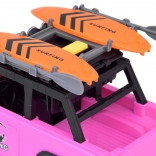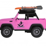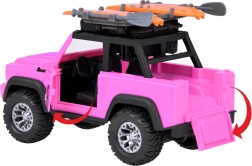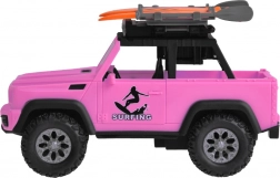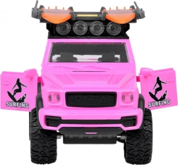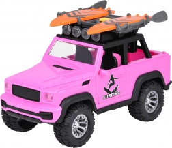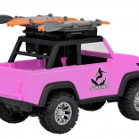 Štýlové ružové terénne auto pre malých dobrodruhov prináša svetelné a zvukové efekty, otváracie dvere, sklápacie veko kufra a veľké gumové kolesá s výrazným dezénom. Na streche nájdete nosič s dvoma surfovacími doskami a svetelný panel pre ešte realistickejšiu hru.