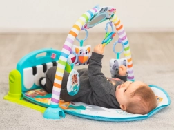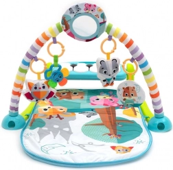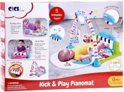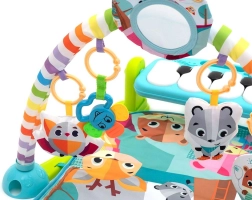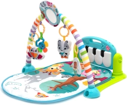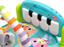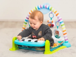 Interaktívne piano so svetelnými efektmi a melódiami motivuje deti k pohybu nožičkami aj ručičkami. Závesné hračky, hrkálky a detské zrkadielko rozvíjajú zrak, sluch i hmat a podporujú koordináciu oko–ruka. Podložka je mäkká, príjemná na dotyk a ľahká na údržbu.