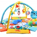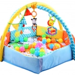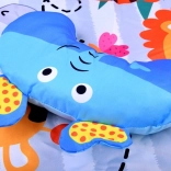 Mäkká podložka s farebnými ilustráciami a závesnými hračkami poskytuje deťom bezpečné a zábavné prostredie.