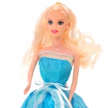 • Bábika je oblečená do nádherných modrých šiat a má dlhé blond vlasy.