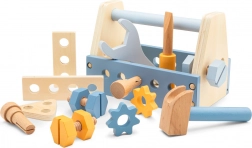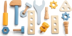 Súčasťou je 16 funkčných dielov: kladivo, skrutkovač, kľúč, klince, skrutky a ozubené kolieska pre nekonečné varianty hry. Výrobok je z FSC certifikovaného dreva, takže podporuje udržateľnú voľbu pre rodičov aj planétu.