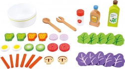 Táto realistická drevená sada na šalát prináša deťom zábavnú možnosť vyskúšať si prípravu obľúbeného jedla. V balení nájdu šalátovú misu, servírovacie príbory, koreničku s čiernym korením, fľaštičky na zálievku a olivový olej aj pestré ingrediencie: listy šalátu, tyčinky mrkvy, plátky húb, vajíčok, uhorky, paradajok, červenej cibule a papriky.