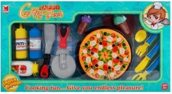 Zábavný detský set pre malých kuchárov prináša všetko na servírovanie obľúbenej pizze a sladkej zmrzliny. Vďaka dielikom spojeným na suchý zips možno pizzu ľahko „krájať“ priloženým kolieskom a podávať na tanierikoch. Set obsahuje pizzu s priemerom 16 cm rozdelenú na 6 dielikov, náradie, tanieriky, zmrzliny aj omáčky – ideálne na rozvoj fantázie a hry na varenie. Bezpečné plastové prevedenie, krájanie na suchý zips a 20 doplnkov pre realistickú hru poteší každé dieťa.