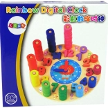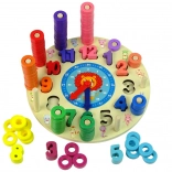 Drevené vzdelávacie hodiny sú ideálnou pomôckou na prvé zoznamovanie s číslami a časom. Každá číslica má svoj farebný kód a dieťa k nej priraďuje zodpovedajúci počet krúžkov na kolíky – zábavná forma, ako si prirodzene osvojiť počítanie a vizuálne triedenie. Otočné ručičky umožnia precvičiť presné čítanie hodín a minút.