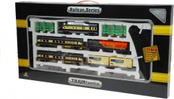 - Lokomotíva, 4 vagóny, koľaje s rozjazdmi, stromy