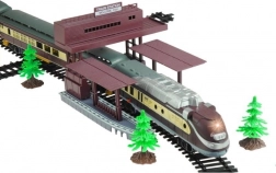 - Bohatá sada: lokomotíva, 4 vagóny, stromy, koľaje a rozjazdy