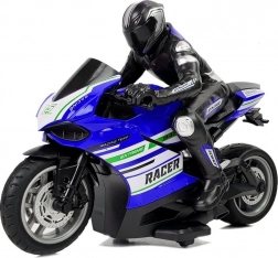 Detailné prevedenie motorky s jazdcom, športovými polepmi a funkčnými kolesami pre autentický zážitok z jazdy.