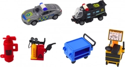 Set obsahuje miniatury autíčok a rôzne doplnky pre realistické hry na záchranné akcie a kontrolu vozidiel.