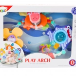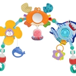 Oranžový krab so šustiacim prvkom a zrkadielkom poskytuje zvuky a stimuluje sluch dieťaťa. Dodatočne, zrkadielko umožňuje dieťaťu objavovať svoj odraz a rozvíjať pozorovacie schopnosti. Modrý žralok s otočnou hrkálkou nie je len roztomilou ozdobou, ale aj zmyslovou hračkou. Otáčajúca sa hrkálka rozvíja motorické schopnosti dieťaťa a poskytuje mu príjemné zvuky počas hrania.