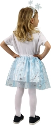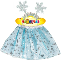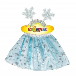 Modrá sukňa s trblietavými snehovými vločkami a saténovým pásom prináša zimné kúzlo.