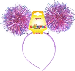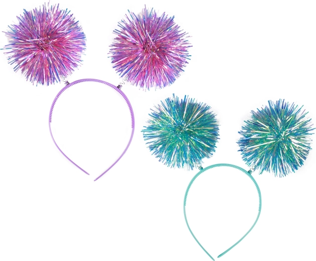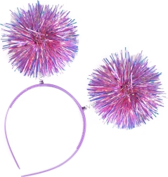 Čelenka je ozdobená dvomi veľkými, trblietavými pom-pom guľami, ktoré pútajú pozornosť a dodávajú veselú atmosféru.