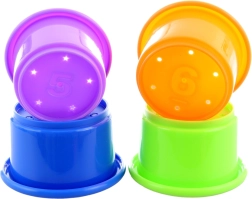 Štyri poháriky s číslami a otvormi sú ideálne na stavanie veží, učenie počítania aj hru s vodou. Precvičujú úchop, logiku a koordináciu.