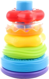 Farebné krúžky rôznych veľkostí učia rozlišovať tvary a farby, rozvíjajú jemnú motoriku a trpezlivosť pri skladaní na tyč.
