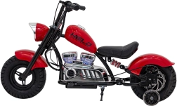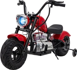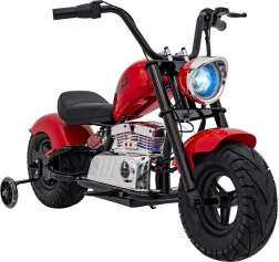 Štýlová detská elektrická motorka v chopper štýle poteší malých jazdcov realistickými detailmi, výkonným bezkomutátorovým motorom 350 W, dvojicou batérií 36 V a stabilizačnými kolieskami pre bezpečnú jazdu. Ponúka nafukovacie kolesá, LED osvetlenie a audio panel s MP3/USB pre ešte väčšiu zábavu.