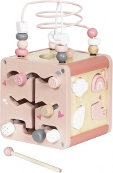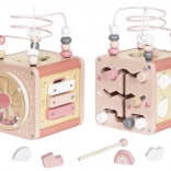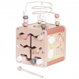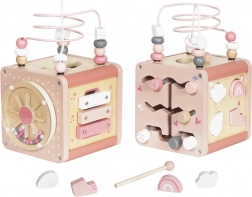Drevená multikocka poskytuje množstvo atraktívnych aktivít, ktoré určite zaujmú a potešia dieťa. Každý prvok je starostlivo navrhnutý pre ľahké uchopenie a manipuláciu malými deťmi. Silná konštrukcia z dreva zaručuje dlhodobú trvanlivosť, zatiaľ čo jemná pastelová grafika stimuluje predstavivosť a sústredenosť. Pohyblivé prvky na kocke rozvíjajú manuálne zručnosti a obratnosť dieťaťa.