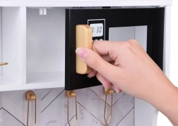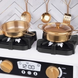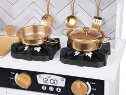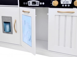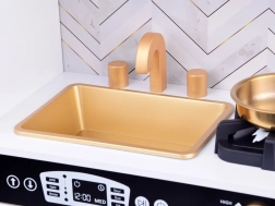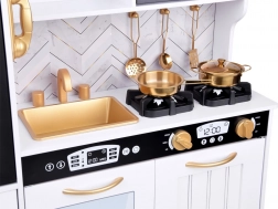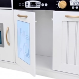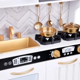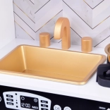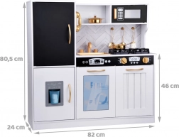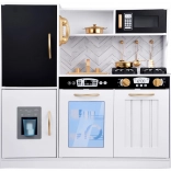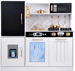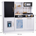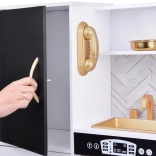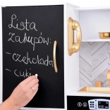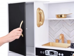 Vznechutenie detského záujmu o varenie s touto drevenou kuchynkou, vyrobenou s dôrazom na detaily. Kuchynka má hlavne biely dizajn s čiernymi a zlatými detailmi, ktoré jej dodávajú eleganciu. Deti môžu písať kriedou na tabuľu umiestnenú na chladničke, napodobňovať varenie v peci a pripravovať jedlo s realistickými zvukovými a svetelnými efektmi.