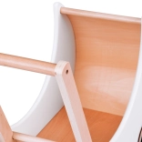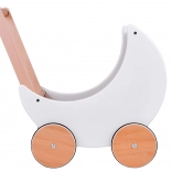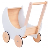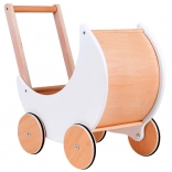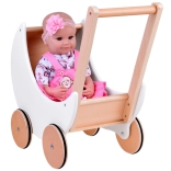 Roztomilý drevený vozík pre bábiky je vyrobený z prírodného dreva, ktoré je bezpečné pre deti. Jeho ergonomický úchyt je prispôsobený malým rúčkam, čo podporuje rozvoj rovnováhy. Gumené kolieska chránia podlahu pred poškrabaním a zaisťujú tichý chod.