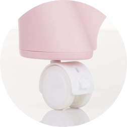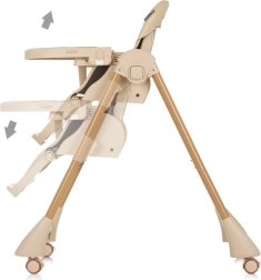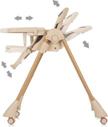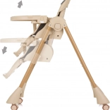 Pre čisté a pohodlné stolovanie je k dispozícii dvojitý podnos – hornú časť môžete kedykoľvek odňať a umyť, zatiaľ čo spodný podnos s ochrannou T-tyčou drží dieťa bezpečne na mieste. Podnos možno posúvať dopredu a dozadu v 3 polohách. Štyri kolieska umožňujú ľahké premiestňovanie po byte a po jedle stoličku jednoducho zložíte do kompaktného tvaru pre úsporu miesta.