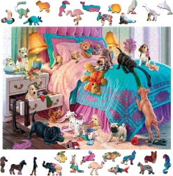 Drevené puzzle WOODEN CITY Nezbedné šteniatka prinášajú zábavu pre deti aj dospelých. Originálne tvarovanie dielikov do siluet zvierat, stavieb a predmetov dodáva skladaniu nový rozmer a niektoré kúsky možno využiť aj ako malé samostatné figúrky. Vďaka laserom zvýrazneným detailom vynikne motív aj kvalita spracovania.