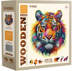 Drevené puzzle Jemný tiger prináša nevšedný zážitok zo skladania. Čakajú vás špeciálne tvarované dieliky, z ktorých niektoré majú podobu zvierat a vďaka laserom zvýrazneným detailom pôsobia ako malé samostatné figúrky. Vyššia náročnosť a menší počet dielikov robia z puzzle zaujímavú výzvu pre dospelých aj staršie deti.