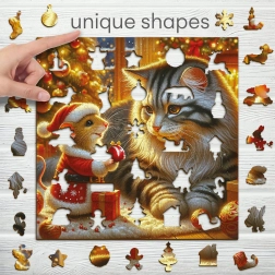 Drevené puzzle WOODEN CITY „Mačka a myš“ prináša netradičné skladanie s originálne tvarovanými dielikmi, z ktorých niektoré majú podobu zvierat a môžu samostatne stáť ako drobné figúrky. Vďaka laserom zvýrazneným detailom a hladkým hranám bez triesok je skladanie príjemné a výsledok vizuálne pôsobivý.