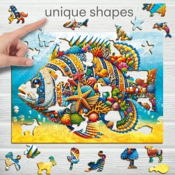 Drevené puzzle Módna ryba od WOODEN CITY je skvelou výzvou vďaka svojim špeciálne tvarovaným dielikom, z ktorých niektoré majú podobu zvierat. Tieto figúrky môžu samostatne stáť, čo obohacuje zážitok zo skladania. Puzzle je vyrobené z pevnej drevovláknitej HDF dosky s hrúbkou 3-4 mm, čo zaisťuje jeho odolnosť a kvalitu. Hladké hrany bez triesok zaisťuje precízne laserové spracovanie.