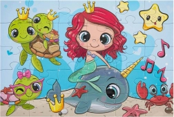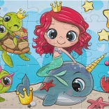 Krásne detské puzzle s motívom morskej víly a zvieratiek z podmorského sveta. Obsahuje 30 veľkých dielikov pre jednoduché skladanie, výsledný obrázok má rozmer 29 × 18 cm. Ideálne ako prvé puzzle pre deti, dodávané v darčekovej krabičke s uchom pre pohodlné prenášanie.