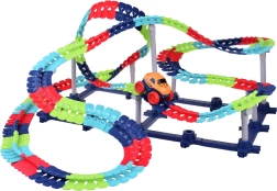 Postavte deťom vlastný závodný svet: dlhý, ohybný a kľukatý autodráhový set s až 291 dielmi umožní vytvárať šialené slučky, mosty aj kopce. Dráha dosahuje až 580 cm, je z pestrofarebných dielikov a vďaka prísavkám ju možno upevniť aj na hladké steny či okná pre skutočne extrémne stavby. Súčasťou je motorové autíčko so svetlami, gumovými pásikmi na kolesách pre lepšiu priľnavosť a nabíjací akumulátor s USB káblom.