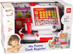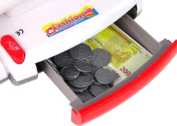 Vďaka funkčnému kalkulátoru a otvorenej zásuvke s peniazmi pripomína pokladňa skutočnú kasu pri hre na obchod.