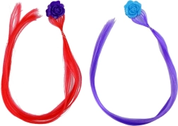 Súčasťou sady sú dva syntetické pramene s kvetinovými sponkami - jeden červený s fialovou ružou a druhý fialový s modrou ružou.
