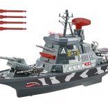 Vyplávajte na dobrodružnú misiu s detailne spracovanou vojenskou loďou, ktorá prenesie deti do sveta námorníctva. Štyri ovládacie tlačidlá spúšťajú rôzne kombinácie svetelných a zvukových efektov – šum mora, streľbu, poplach aj hlas kapitána v angličtine. Otočný radar sa rozsvieti a dodá hre na autenticite, zatiaľ čo pristávacia plocha na zádi, kotva na prídi a pohyblivé zbrane podporujú tvorbu vlastných bojových scenárov.