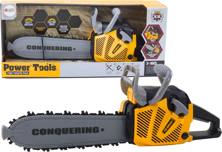 Realistická detská motorová píla na batérie s bezpečným gumovým reťazom ponúka svetelné a zvukové efekty, jednoduché ovládanie a odolné spracovanie. Skvelá na kreatívnu hru na remeselníkov a rozvoj jemnej motoriky a koordinácie. Vhodná pre deti od 3 rokov, s certifikáciou CE a zhodou s EN71.