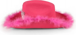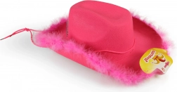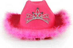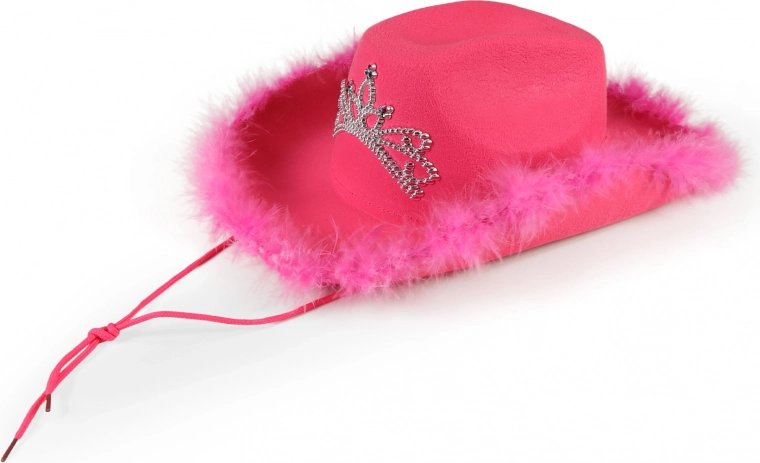 Žiarivo ružový kovbojský klobúk pre dospelých s korunkou z kamienkov a pierkovým lemom dodá každej akcii dávku glamu. Vďaka nastaviteľnej šnúrke pohodlne drží na hlave, výška klobúka je 15 cm – ideálny na párty, karneval či rozlúčku so slobodou.