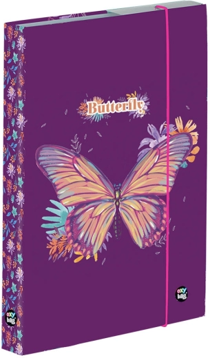 Praktický školský box na zošity vo formáte A5 s motívom motýľa. Chráni vaše zošity a papiere vďaka odolnému laminu, má zapínanie na gumičku a 3 cm široký chrbát pre viac obsahu.
