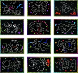 Táto sada škrabacích obrázkov je ideálnou voľbou na prvé tvorenie. Jednoduchý princíp stierania celého motívu bez zložitých detailov deti ľahko pochopia a okamžite uvidia výsledok: krásne trblietavé a farebné obrázky, ktoré sa efektné lesknú.