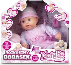 Interaktívne bábätko s doplnkami Natalia Collection je ako naozajstné: reaguje na dotyk a pohyb, vydáva realistické zvuky (smiech, plač, spánok), hovorí „mama“ a „tata“ a po kŕmení z fľaštičky si odgrgne. Mäkké telíčko, cumlík a vankúšik v balení – ideálna hračka pre deti od 2 rokov.
