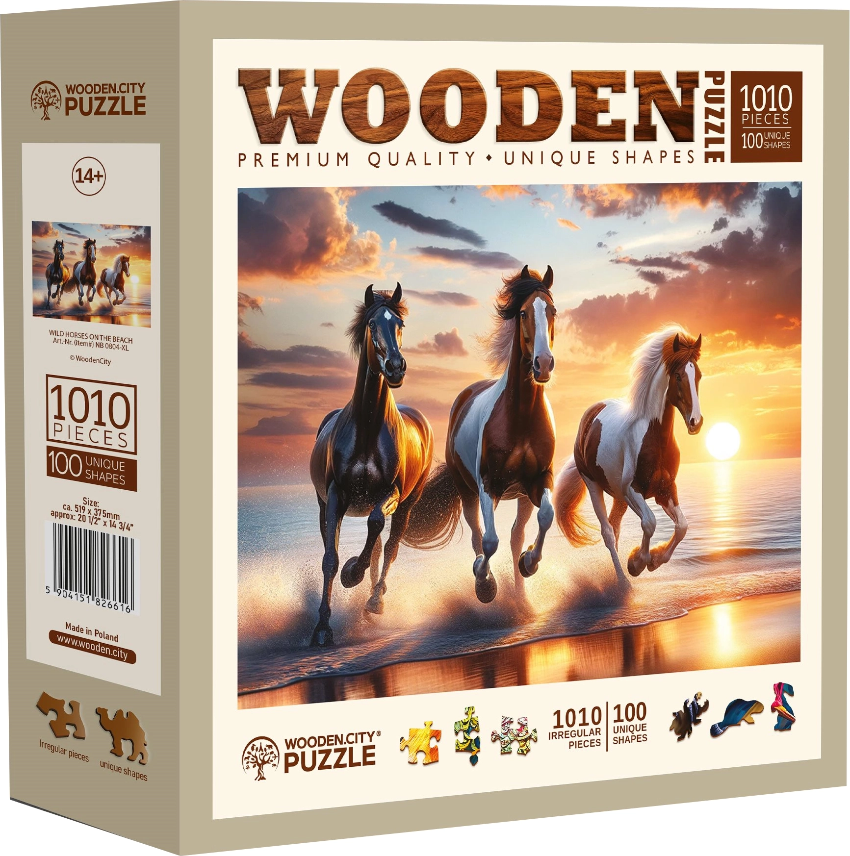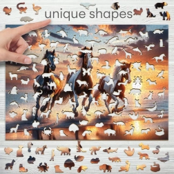Vstúpte do sveta kvalitných drevených puzzle s motívom divokých koní na pláži. WOODEN CITY prináša laserom vyrezávané dieliky z pevnej HDF dosky s hrúbkou 3–4 mm, ktoré sa vyznačujú hladkými hranami a dlhou životnosťou. Časť dielikov je v tvare zvierat a vďaka jemným detailom môže slúžiť aj ako drobné figurky.