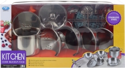 Nerezová súprava riadu obsahuje hrniec, cedník, panvicu, misu, nízky hrniec, 2 pokrievky, naberačku na polievku, obracačku, ručný malý cedník a naberačku na cestoviny. Balené v krabici. Rozmery balenia cca 38×20×10 cm. Vek 3+
