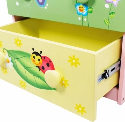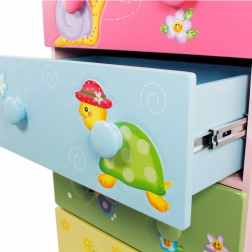 Každý šuplík zdobí originálny motív zvieratka alebo kvetiny, vďaka čomu je komoda nielen úložným priestorom, ale aj hrou pre deti.