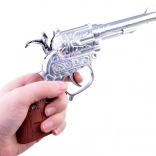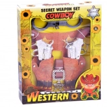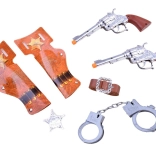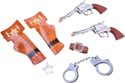 Súprava zahŕňa všetko potrebné pre realistickú hru na kovboja: 2 revolvery, putá, opasok a šerifskú hviezdu.