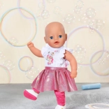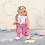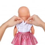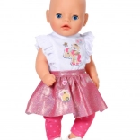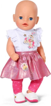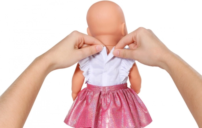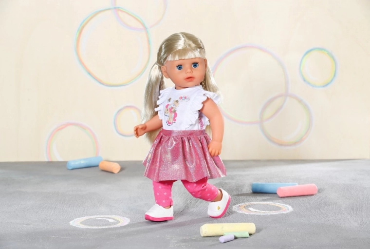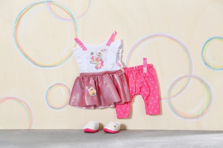 Štýlová súprava oblečenia pre bábiku BABY born Little 36 cm prináša všestranný look na každý deň. Obsahuje biely top s volánmi a potlačou, trblietavú ružovú sukňu, ružové legíny s hviezdičkami a biele topánky. Vďaka strihu easy fit sa oblečenie ľahko oblieka aj vyzlieka, podporuje rolové hry a rozvíja jemnú motoriku detí.