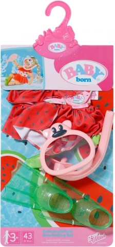 Táto zábavná sada doplnkov premení každé kúpanie bábiky na malé dobrodružstvo. Farebné plavky s motívom melónu, ľahké plutvy a pohodlná šnorchlovacia maska skvele sedia na bábiky BABY born s veľkosťou 43 cm a podporujú fantáziu a kreatívnu hru.