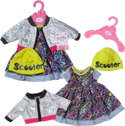 Vyrazte do mesta vo veľkom štýle. Táto sada pre bábiku BABY BORN 43 cm kombinuje elegantné vrstvené šaty s výraznou písmenkovou potlačou, lesklú bundu so strieborným vzorom a kontrastnými manžetami a praktickú žltú čiapku, ktorá ochráni účes pod prilbou pri jazde na skútri.