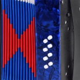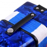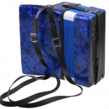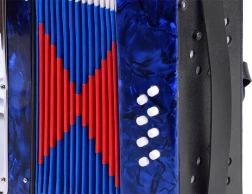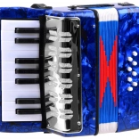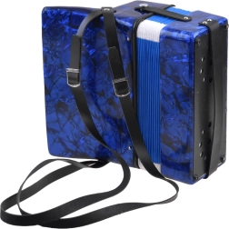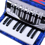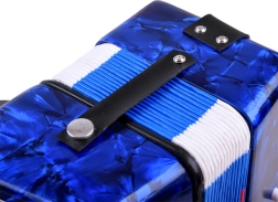 Lesklé modré telo s mramorovým efektom, klávesy a basové tlačidlá. Akordeón znie čisto a príjemne – ideálny pre prvé hudobné zážitky.